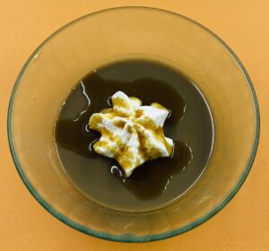 ほうじ茶プリンを作り、ホイップしたあとに黒蜜をかけ、和風デザートに仕上げました。
