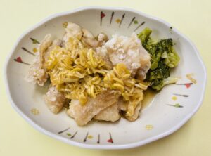 市販品では食べやすい一口大程度の鶏のから揚げに、タしをかけたり、まぶした物もありますが、当院では一枚肉を切ったから揚げにタレをかけた形で提供させていただきました。