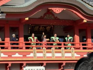 当日は、晴れ渡る青空の下、芸能人の方々が来られ、境内から豆をまき、